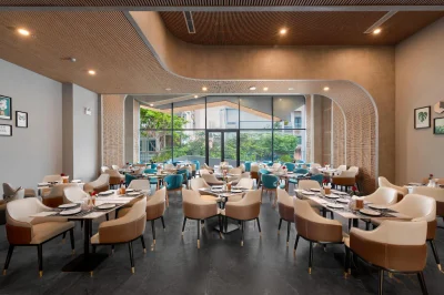 Nhà hàng “Sunrise Restaurant” phục vụ khẩu vị Á–Âu, buffet sáng và các món đặc sản vùng biển.